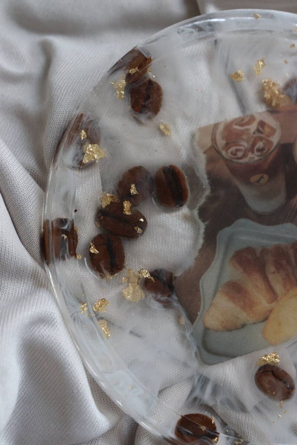 Ce vide-poche en résine époxy capture parfaitement l’ambiance d’un matin gourmand : grains de café, touches dorées et image rétro d’un petit-déjeuner croissant-latte. Chaque détail est figé dans la transparence de la résine pour un rendu à la fois chaleureux et original. Idéal pour les amateurs de café et de décoration cosy.