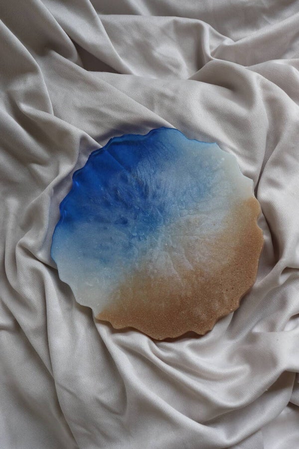 Plonge dans une ambiance bord de mer avec ce vide-poche en résine époxy inspiré des nuances de l’océan et du sable doré. Son dégradé bleu profond, blanc nacré et doré évoque les vagues qui se fondent sur la plage. Entièrement fabriqué à la main, chaque pièce est unique et révèle des reflets changeants selon la lumière.