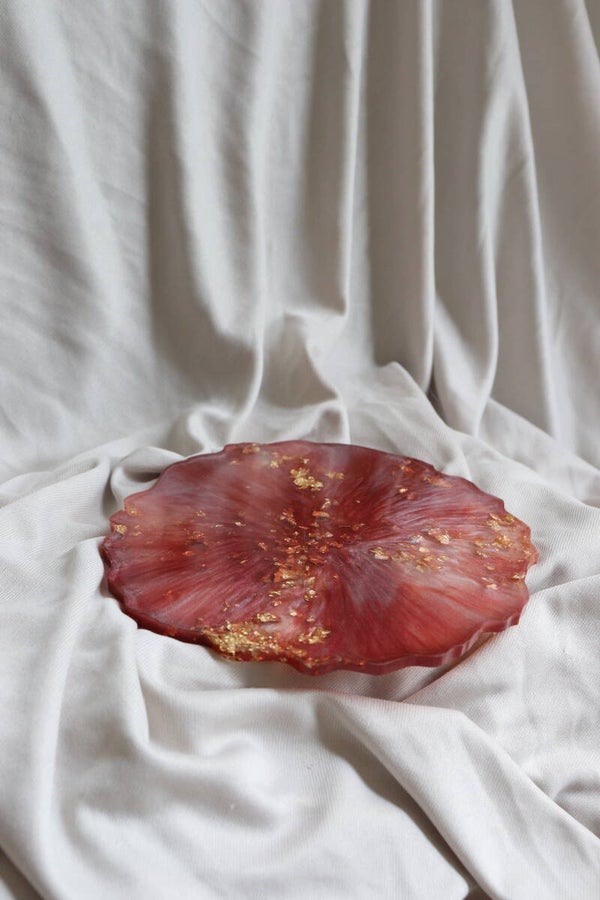 Ce vide-poche en résine époxy mêle intensité et élégance avec ses nuances profondes de rouge rubis rehaussées de feuilles d’or véritables. Sa forme délicatement ondulée évoque le mouvement d’un pétale ou d’une flamme, et chaque reflet doré capte la lumière différemment selon l’angle. Une pièce unique à la fois raffinée et chaleureuse.