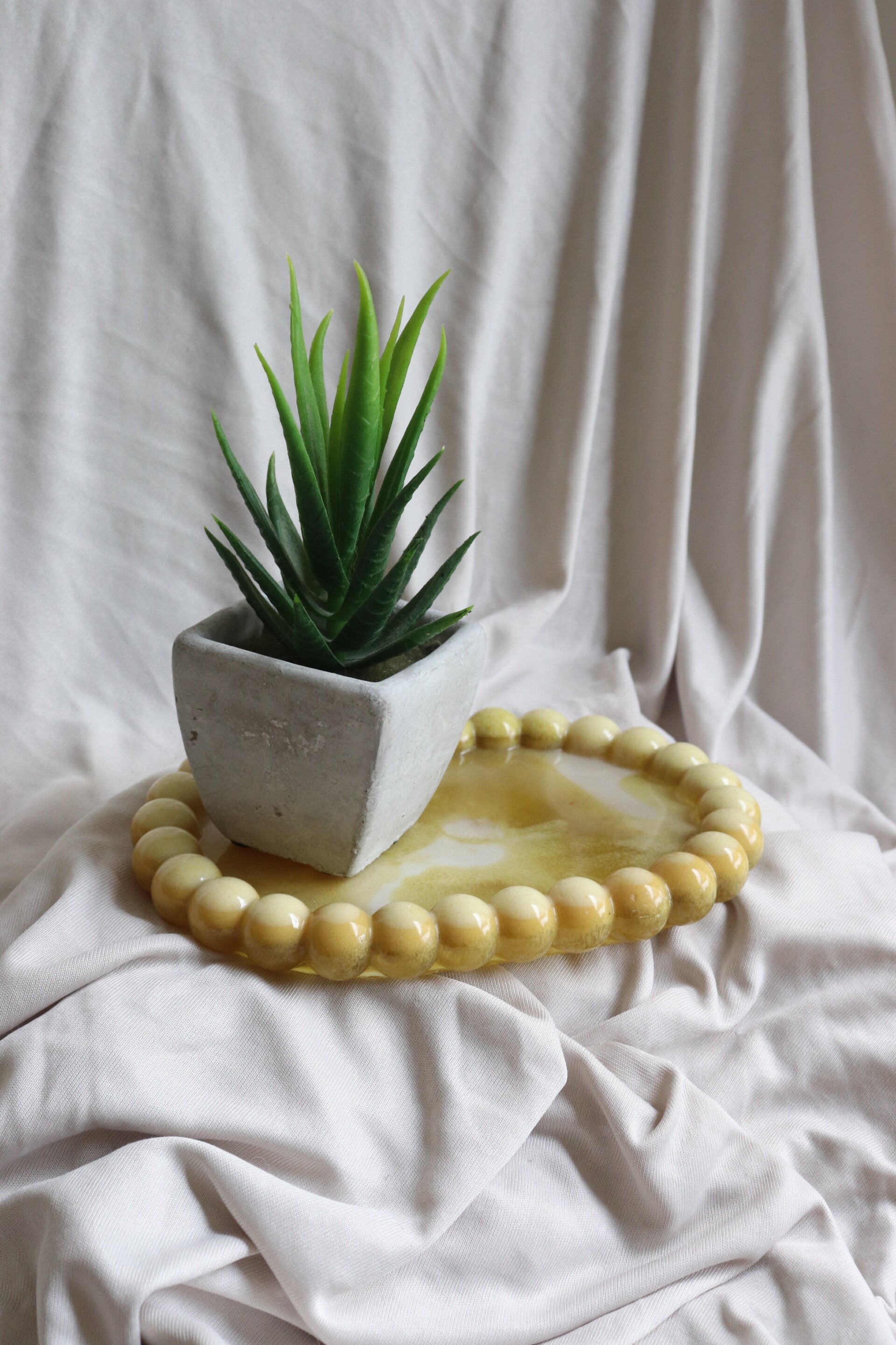Ce plateau ovale à bord perlé est une véritable pièce de caractère. Réalisé à la main en résine époxy, il arbore de délicates nuances dorées et miel, rehaussées d’un effet nacré lumineux. Les perles arrondies qui encadrent le plateau lui confèrent un aspect élégant et intemporel, parfait pour illuminer une décoration.