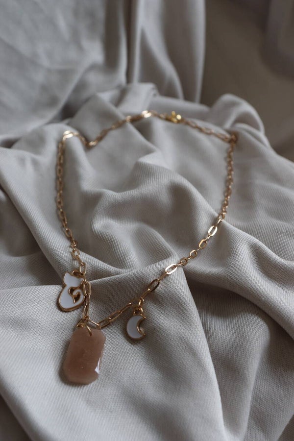 Composé d’une chaîne dorée en acier inoxydable et de trois pendentifs assortis — une lune, un chat stylisé et une médaille en résine beige pailletée — il incarne à la fois la sérénité, la protection et la douceur.