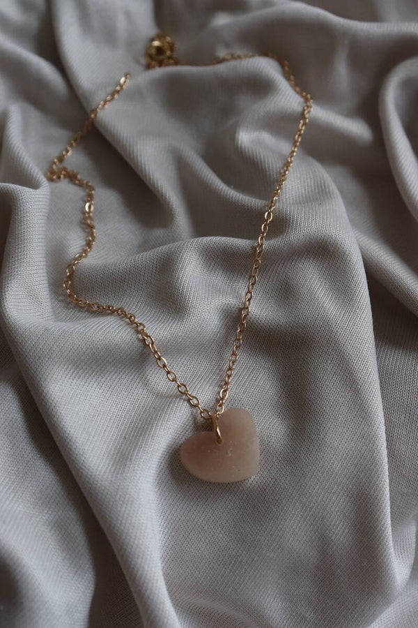 Le collier “Cœur de Sable” se distingue par son pendentif en forme de cœur, délicatement teinté d’un beige chaud rappelant les dunes et la lumière dorée du soleil.